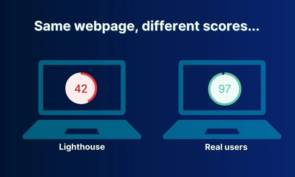 Why? Lighthouse scores are not based on your real user experience. In fact, they measure completely different metrics. We call this lab data, or synthetic data. It's also not the same as Core Web Vitals.