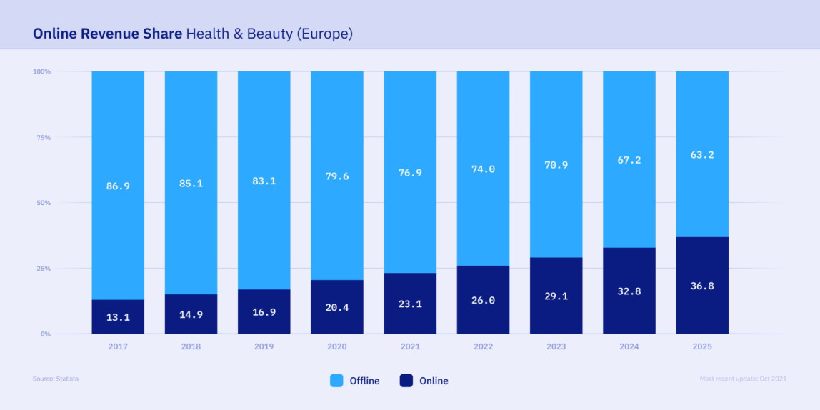 Percentage of Health and Beauty revenues sold online vs offline in Europe in 2021