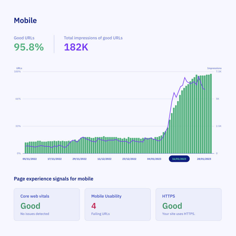 Hugely improved web vitals score showing we are delivering the best customer journey possible and keeping Google happy which should lead to better domain authority assisting organic and Paid Search. This has given us 95.8% of good URLs on Google Page Experience reports.
