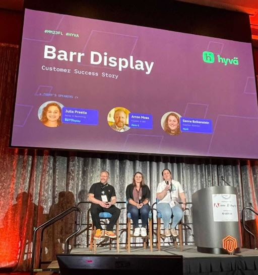 Barr Display has recently turned around diminishing conversions and organic traffic by implementing Hyvä to remove the clunky UX. The experience was so positive that Julia Prestia from Barr Display was happy to share her story on stage at Meet Magento Florida 2023 along with Arron Moss from Agency Zero-1 and Sanne Bolkenstein, Commercial Director at Hyvä.